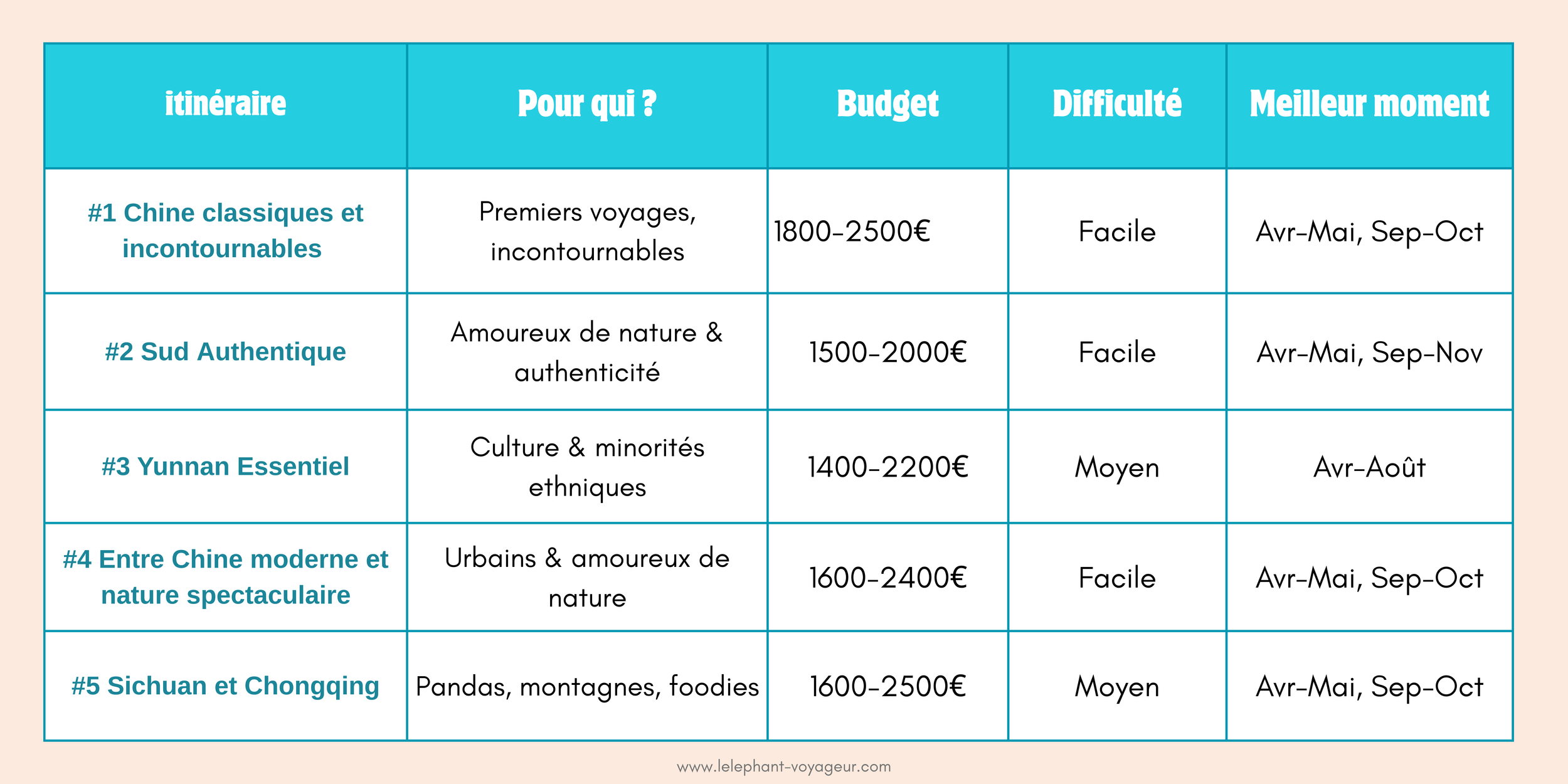Pour t'aider à choisir, voici un tableau récapitulatif des 5 itinéraires :
