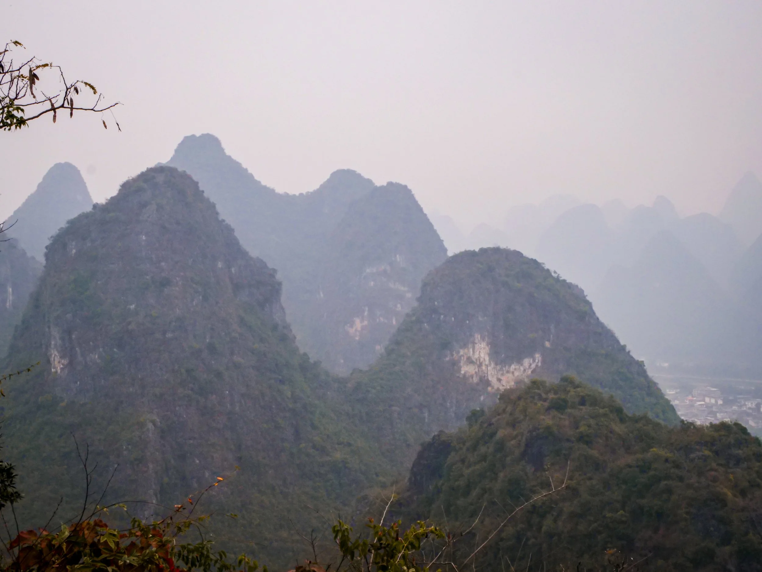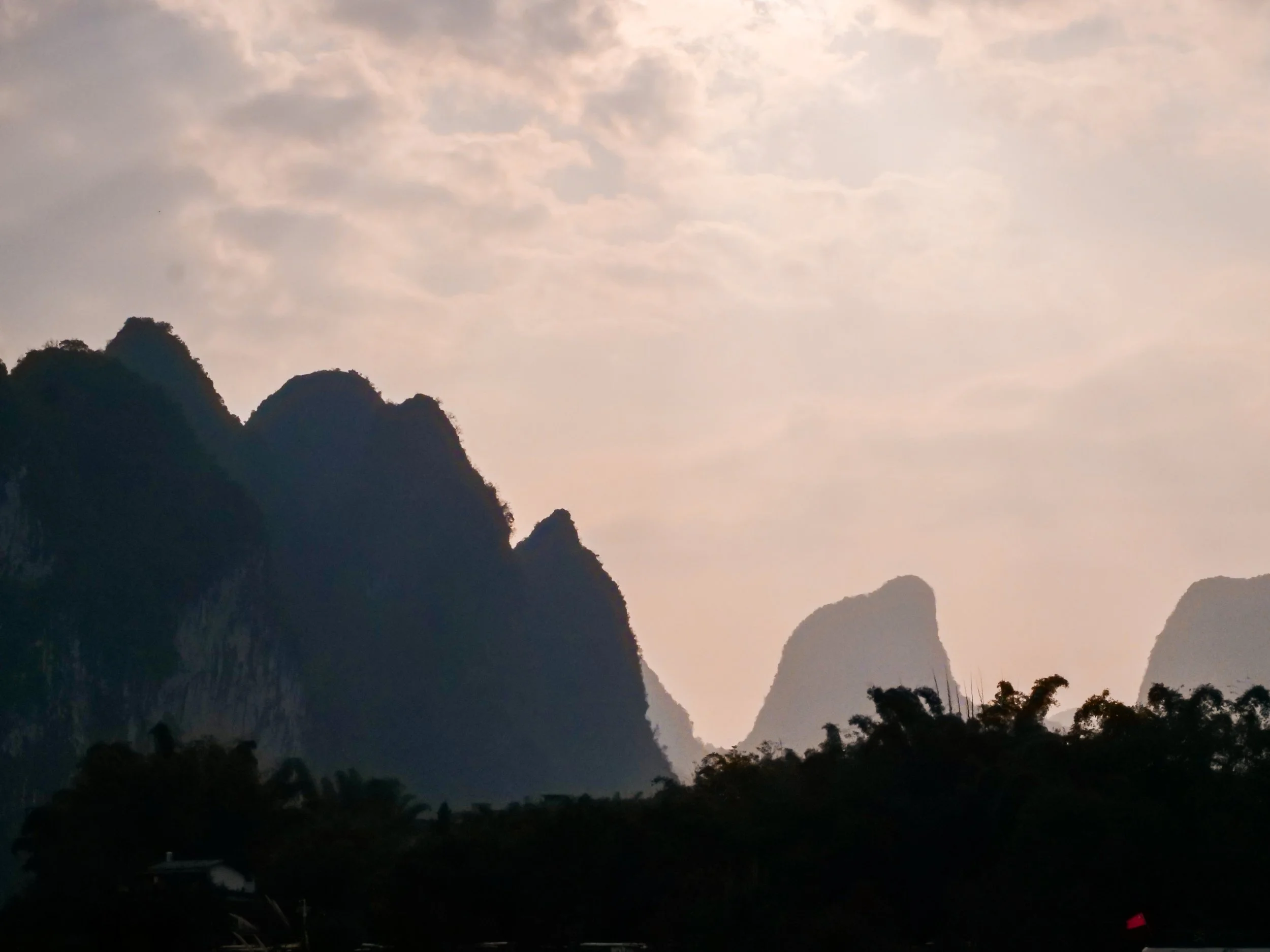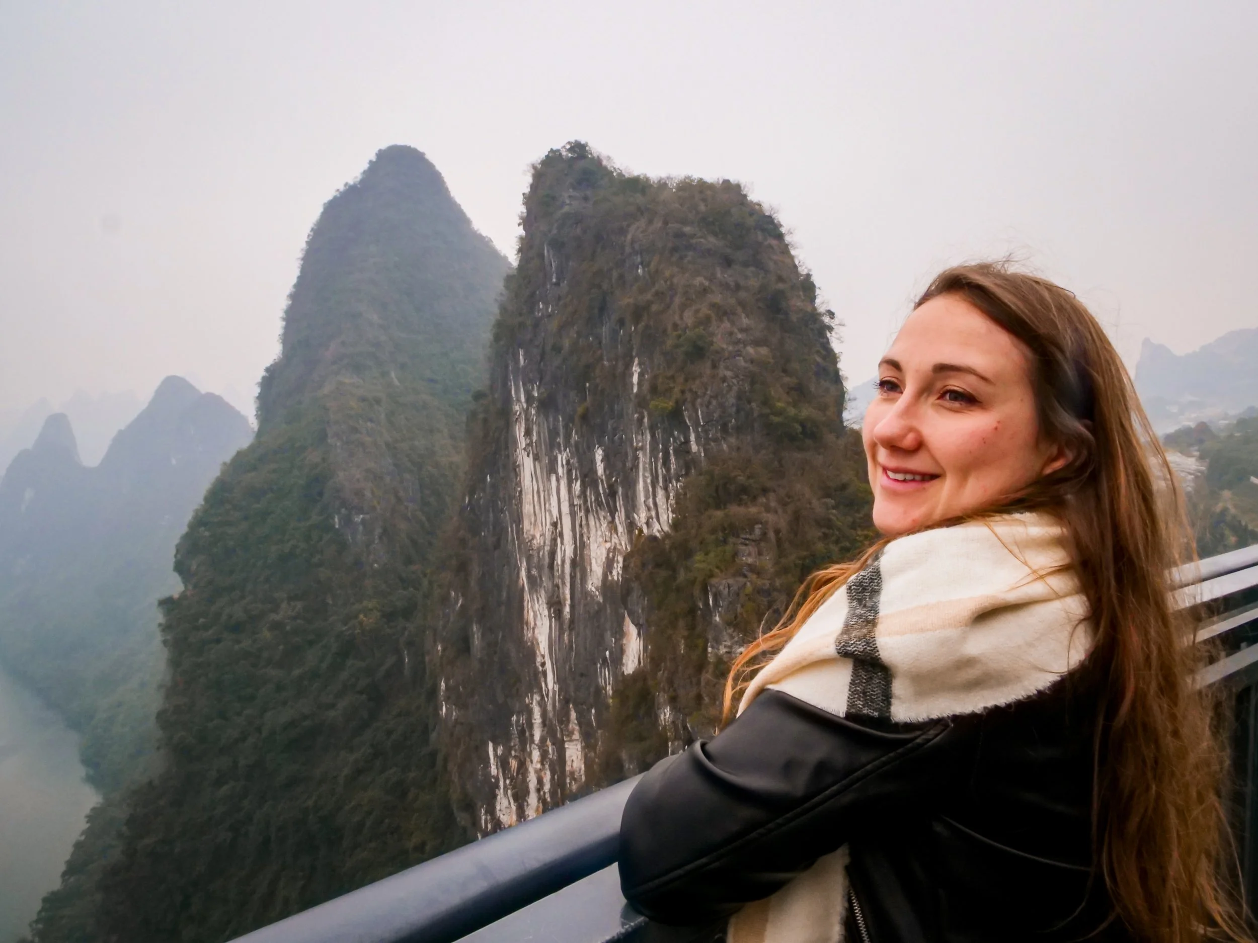 Bon, de notre côté, nous n'avons malheureusement pas eu la chance d'avoir un ciel dégagé lors de notre visite : le temps était couvert et la vue partiellement masquée par les nuages bas. Mais même dans ces conditions, nous avons pu distinguer les silhouettes majestueuses des montagnes karstiques qui émergeaient de la brume, créant une atmosphère mystique presque irréelle qui m'a beaucoup plu. C'est exactement ce genre d'ambiance qu'on voit dans les peintures traditionnelles chinoises, avec ces montagnes qui semblent flotter dans les nuages.