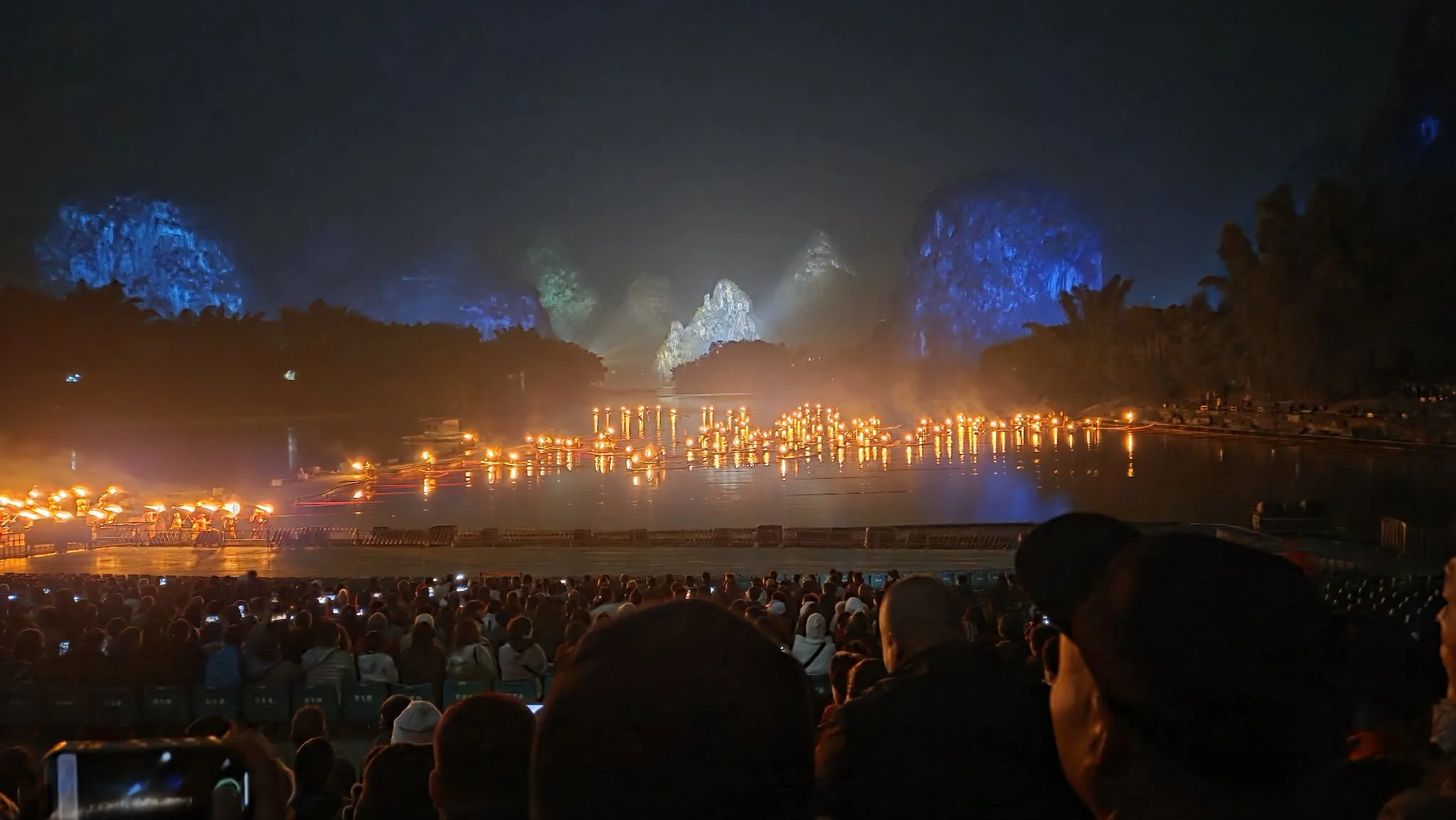 Plus sérieusement, s'il y a bien une activité qu'il ne faut pas manquer à Yangshuo, c'est le spectacle nocturne Impression Liu Sanjie 印象刘三姐. Créé par le célèbre réalisateur Zhang Yimou (qui a notamment orchestré les cérémonies d'ouverture des Jeux Olympiques de Pékin 2008), ce spectacle grandiose met en scène l'histoire de Liu Sanjie, une chanteuse légendaire de la minorité Zhuang dont les talents musicaux auraient charmé toute la région du Guangxi. Le spectacle mêle chants traditionnels, danses chorégraphiées et jeux de lumières spectaculaires, mais sa particularité la plus impressionnante reste son décor : la représentation se déroule directement sur les eaux de la rivière Li, utilisant les montagnes karstiques environnantes comme toile de fond naturelle. Plus de 600 artistes locaux, dont beaucoup sont des pêcheurs et agriculteurs de la région, participent à ce spectacle monumental qui s'étend sur près de 2 kilomètres de rivière.